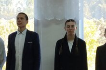 Почетное право поднятия флага РФ и РТ предоставлено ученикам 9 класса: Самигуллиной Асие, победителю Межрегиональной конференции с участием Фоата Галимуллина, и лауреату вышеназванной конференции Закирову Булату./РФ һәм ТР флагын күтәрүнең мактаулы хокукы 9 сыйныф укучыларына бирелә: Фоат Галимуллин катнашындагы төбәк-ара конференциядә шигырь сөйләүчеләр конкурсында җиңүче Сәмигуллина Асиягә һәм югарыда аталган конференция лауреаты Закиров Булатка бирелде..