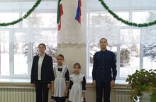 11 декабря было торжественное открытие недели истории и обществознания. Поднятию флага были удостоены ученицы 2, 3 классов Валиева Р. и Аглямова А., призёры конференции "Память сердца" имени С. Ахтямова, земляка Героя Советского Союза. / 11нче декабрьдэ тарих, жэмгыять белеме атналыгы игьлан ителде. Советлар Союзы Герое С. Ахтямов исемендэге "Йорэк хэтере" конференциясенен призерлары 2, 3 нче сыйныф укучылары Валиева Р., Аглямова А. гэ флаг кутэру хокукы бирелде.