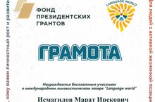 За победу в республиканском конкурсе по английскому языку среди обучающихся общеобразовательных учреждений Республики Татарстан, ученик 9 класса Исмагилов Марат, награждается в международном лингвистическом лагере «language world».