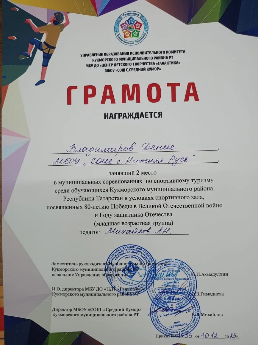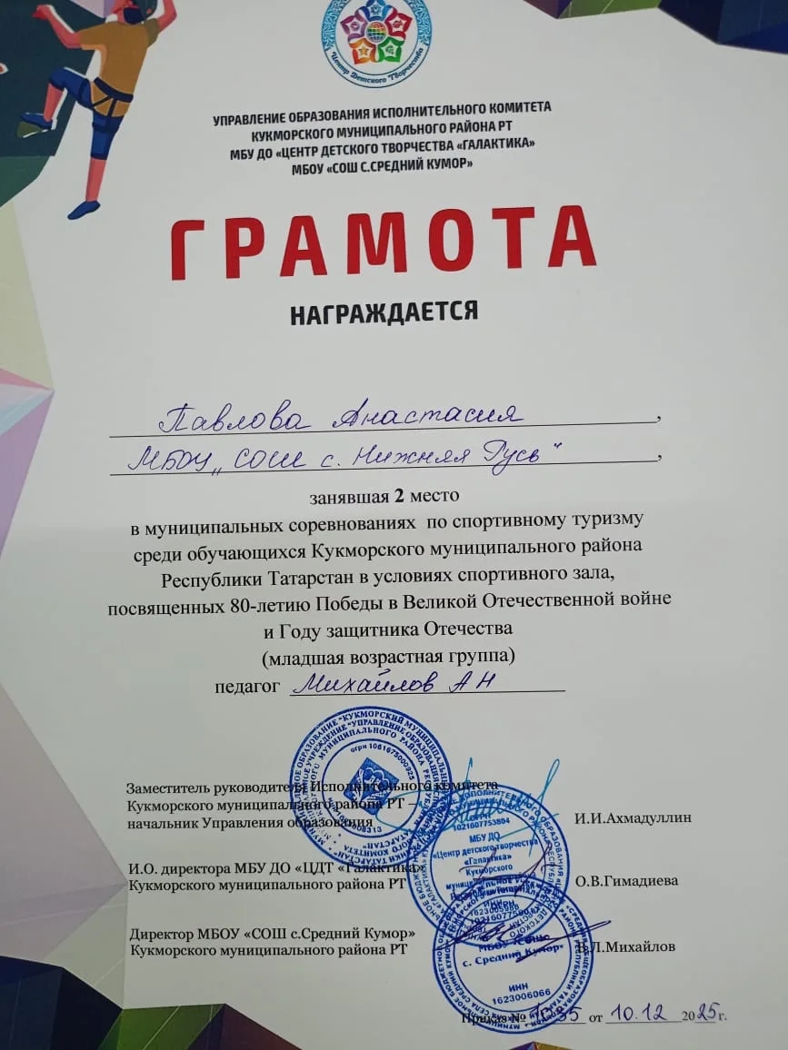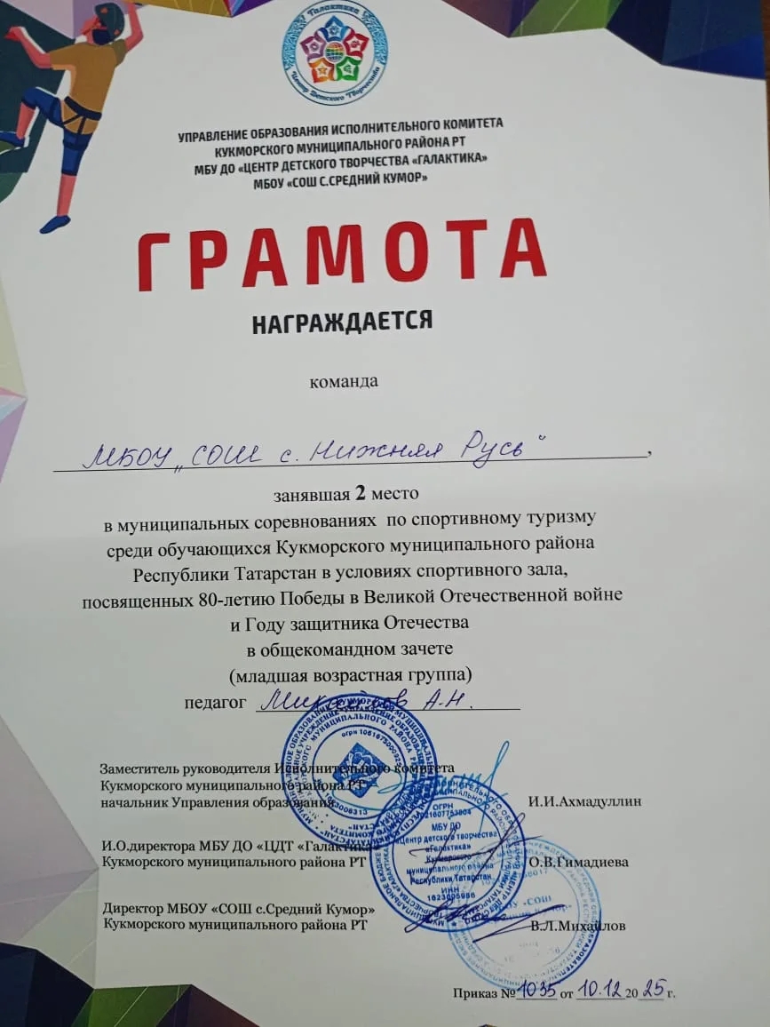 Утро понедельника в нашей школе традиционно начинается с торжественной линейки, исполнения гимна Российской Федерации Республики Татарстан. Директор школы Гайнутдинов Ирек Зиятдинович по традиции вручает грамоты за участие и победу в различных конкурсах.На этот раз получила грамоту команда занявшая 2 место по спортивному туризму среди обучающихся нашего района в условиях спортивного зала, посвященных 80-летию Победы в Великой Отечественной войне и Году защитника Отечества, которые прошли в "МБОУ "СОШ Средний Кумор". Мы поздравляем наших юных туристов и желаем им дальнейших побед!