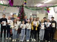 28 декабря в нашей школе прошел Бал-маскарад. На протяжении всего праздника старшеклассники на празднике пели новогодние песни, плясали, водили хороводы, в общем, веселились от души. Очень интересно прошли конкурсы «Наряжаем елку», «Новогодний хоровод», танцевальный конкурс, игры со стульями и много других интересных конкурсов и новогодних забав. Присутствующие на празднике принимали самое активное участие и им, Дед Мороз, Снегурочка, вручали подарки. Праздник завершился новогодней дискотекой./ 28 декабрьдә безнең мәктәптә Бал-маскарад узды. Бәйрәм дәвамында югары сыйныф укучылары бәйрәмдә яңа ел җырларын җырладылар, биеделәр гомумән, күңел ачтылар. «Чыршы бизибез», «Яңа ел хорводы», бию конкурсы, урындыклар белән уеннар һәм башка бик күп кызыклы конкурслар һәм яңа ел күңел ачулары бик кызыклы узды. Бәйрәмдә катнашучылар бик актив катнаштылар һәм аларга, Кыш Бабай, Кар кызы, бүләкләр тапшырдылар. Бәйрәм Яңа ел дискотекасы белән тәмамланды