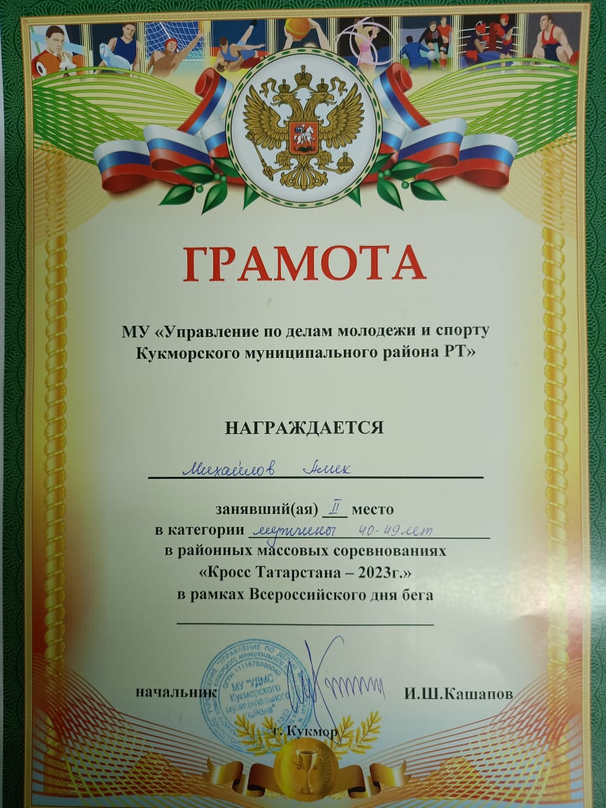 Всероссийский день бега "Кросс Татарстана-2023" прошел на стадионе имени Р. Мухаметшина в Кукморе. На этом мероприятии нашу школу представили Михайлов Алик, Зиннатов Рустам, Ахметова Алия, Саптаров Герман и Филиппов Данил. Михайлов Алик Николаевич занял достойное 2-е место среди мужчины 40-49 лет/"Татарстан кроссы-2023" Бөтенроссия йөгерү көне Кукмараның Р.Мөхәммәтшин исемендәге стадионында узды. Бу чарада безнең мәктәпне Михайлов Алик, Зиннатов Рөстәм, Ахметова Алия, Саптаров Гермна һәм Филиппов Данил тәкъдим итте. Михайлов Алик Николаевич 40-49 яшьлек ир-атлар арасында лаеклы 2 нче урынны алды