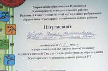 27 января в Кукморском муниципальном районе прошла зимняя Спартакиада работников образования. Наша команда выступала в составе 11 человек: Зайцева В. Н., Галимьянова Л. В., Ромазанова О. М., Нигматуллина Л. В., Сабанчеева Т. А., Васильев И.М., Мусина Э. М., Зайцев С. Н., Сабанчеева Н. Л., Танасева М. А., Герасимов М. А. Учитель физической культуры и ОБЖ Зайцев С. Н. занял 2 место по настольному теннису. Поздравляем!