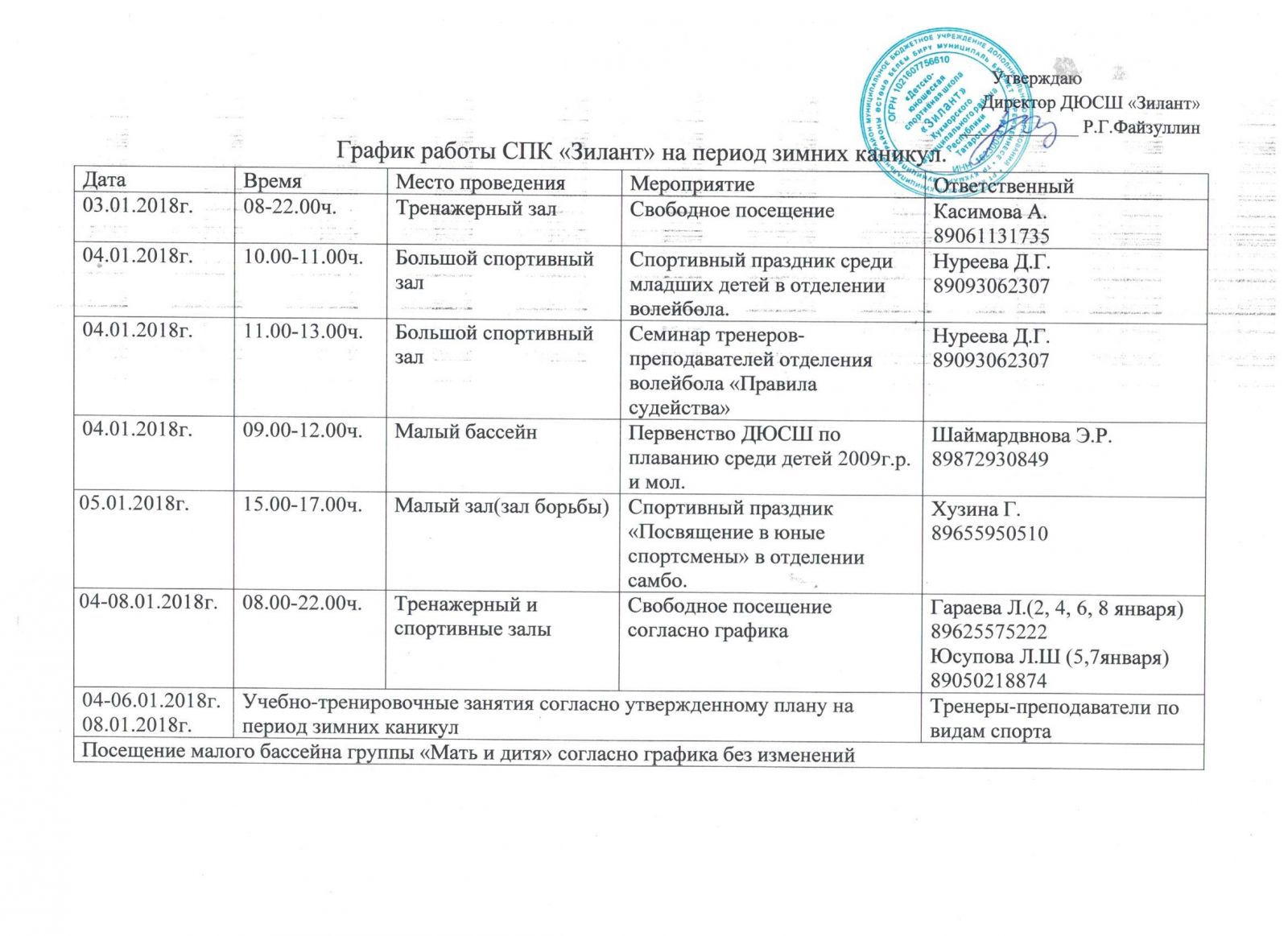 График работы СПК Зилант на период зимних каникул