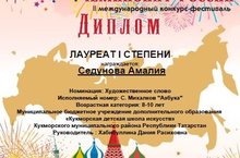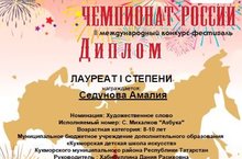 Учащаяся театрального отделения Кукморской детской школы искусств Седунова Амалия приняла участие в Международном конкурсе - фестивале «Чемпионат России», где, под руководством Хабибуллиной Д.Р., завоевала диплом Лауреата 1 степени.