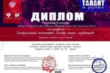 Театральный коллектив «Театр юных сорванцов» Кукморской детской школы искусств, под руководством Хабибуллиной Д.Р., были удостоены диплома Лауреата 3 степени Международного фестиваля- конкурса талантов «Талант и успех».