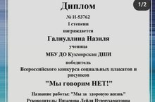 Сәнгать бүлеге укучысы Галиуллина Нәзилә "Мы говорим НЕТ!" дигән Бөтенроссия социаль плакат һәм рәсем конкурсында катнашты, анда 1 дәрәҗә Дипломга лаек булды, жит Низамова Л.Н.