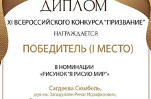 Учащаяся художественного отделения Сагдеева Сюмбель (рук. Загидуллин Р.И.) приняла участия во Всероссийском конкурсе "Призвание" в номинации "Я рисую мир" и заняла почетное 1 место. Поздравляем победителя!
