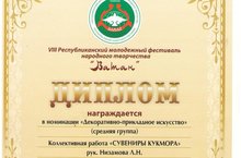 27 марта 2018 года учащиеся художественного отделения Кукморской детской школы искусств Эльмира Сабирзянова и Лада Исламова (класс преподавателя Низамовой Лейли) приняли участие в VIII Республиканском молодежном фестивале народного творчества «Ватан» в г. Казани с коллективной работой «Сувениры Кукмора» в номинации «ДПИ».