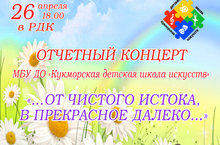 26 апреля 2018 года в 18:00ч. в РДК состоится отчетный концерт Кукморской детской школы искусств ",,,От чистого истока, в прекрасное далеко,,". Билеты в кассе РДК.