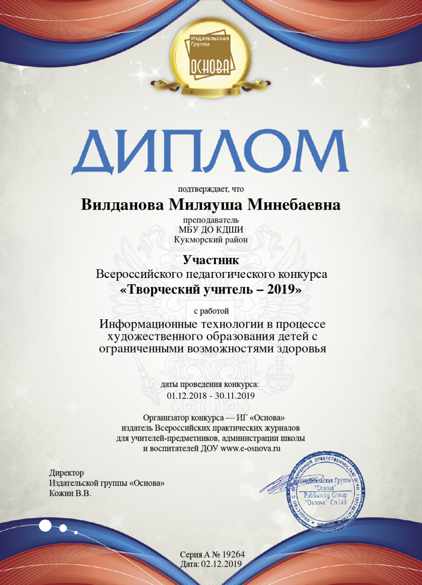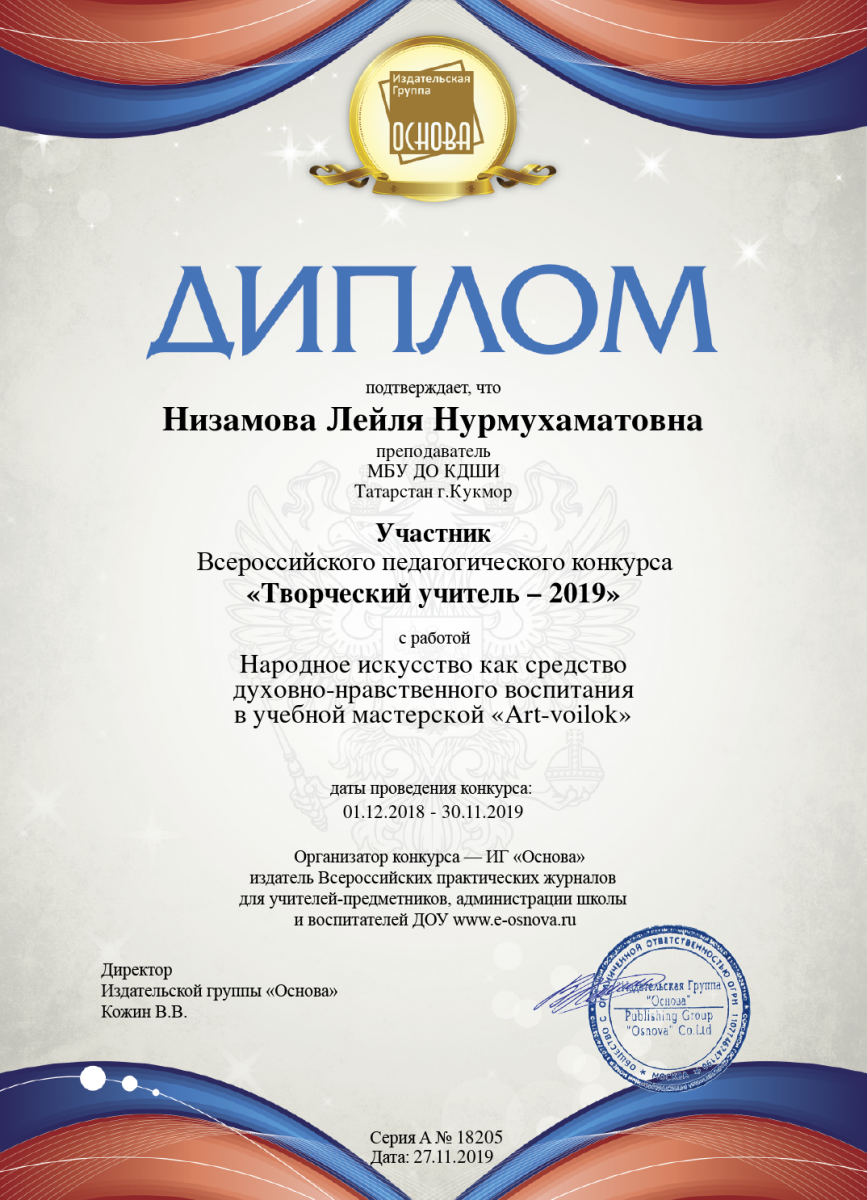 6. Низамова Лейля Нурмухаматовна- Участник Всероссийского педагогического конкурса "Творческий учитель 2019 " с работой "Народное искусство, как средство духовно- нравственного воспитания в учебной мастерской Art- Voilok"