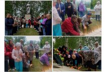 Участники акции набирали воду в руки и поливали цветы и деревья - таким образом символически поделились водой с теми, кого уже нет.
