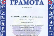 Всероссийском юношеском турнире по бадминтону «АЛЬМЕТЬЕВСК-ОПЕН» этапе Первенства России возрастной группе 2004-2005 г.р., учащийся 8 класса Чертков Кирилл занял II - место в парном разряде с Кодоловым Антоном из г. Казань