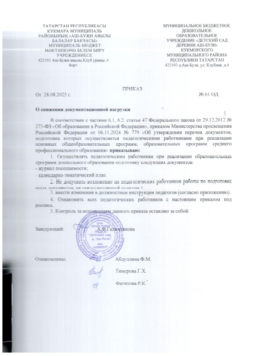 Приказ от 05.08.2025 г. № 50 "О проведении самоанализа рабочей документации педагогических работников и создания рабочей группы МБДОУ "Детский сад д. Аш-Бузи"