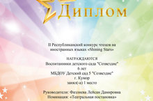 Чит телләрдәге "Shining stars" II республика нәфис сүз осталары конкурсына йомгак ясалды. "Звездочки" мәктәпкә әзерлек төркемендә тәрбияләнүчеләр (җитәкчесе - инглиз теле укытучысы Фазлиева Л. Д.) мактаулы 1 урынны яуладылар. Котлыйбыз!!!