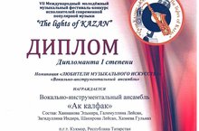Музыкальные руководители нашего поселка - вокально-инструментальный ансамбль "Ак калфак" выступили в VII Международном молодежном музыкальном фестивале-конкурсе исполнителей современной популярной музыки "The lights of KAZAN", проходившем при поддержке Министерства культуры РТ и Казанского государственного института культуры и стали дипломантами I степени в номинации "Любители музыкального искусства"-"Вокально-инструментальный ансамбль". Поздравляем победителей и желаем дальнейших творческих успехов!