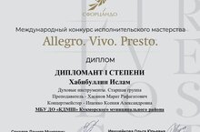 Хабибуллин Ислам – учащийся отделения духовы инструментов, под руководством преподавателя Хасанова М.Р. и концертмейстера Ищенко К.А. принял участие в международном конкурсе инструментального исполнительства «ALLEGRO.VIVO.PRESTO» и удостоился звания Дипломанта 1 степени! Желаем здоровья, вдохновения и дальнейших творческих успехов!Котлыйбыз!!! Хәбибуллин Ислам - инструментларның рухи бүлеге укучысы, укытучы Хәсәнов М.Р. һәм концертмейстер К.А. Ищенко К.А. җитәкчелегендә «ALEGRO.VIVO.PRESTO» Халыкара инструменталь башкаручылар конкурсында катнашты һәм 1 дәрәҗә Дипломант исеменә лаек булды! Сәламәтлек, илһам һәм алга таба да иҗади уңышлар телибез!