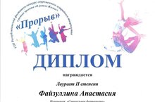 Казан шәһәрендә узган «Прорыв» VIII республика фестиваль-конкурсының нәтиҗәләре билгеле булды. «Инструменталь башкару» номинациясендә фортепиано сыйныфы укучысы Фәйзуллина Анастасия, (ук. Хәкимуллина А.Л.) 2 дәрәҗә Лауреат исеменә лаек булды!