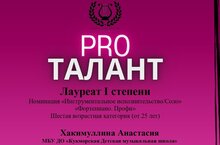 Стали известны результаты Международного многожанрового конкурса "Pro талант" , прошедшего в г.Казань. В номинации "Инструментальное исполнительство - фортепиано» приняла участие преподаватель нашей школы по классу фортепиано Хакимуллина Анастасия Лазаревна и удостоилась звания Лауреата 1 степени, а также награждена специальным дипломом "За исполнительское мастерство"! Поздравляем Анастасию Лазаревну и желаем дальнейших успехов!!!