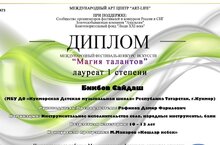 Поздравляем!!! Желаем дальнейших успехов!!!27 ноябрьдә С.Петербург шәһәрендә узган "Сәнгать магиясе" Халыкара сәнгать конкурсы нәтиҗәләре билгеле булды. «Инструменталь башкару» номинациясендә баян классы укучысы Бикбов Сәйдәш һәм укытучы Д.Ф.Рафиков катнаштылар. Бикбов Сәйдәш (соло) - 1 дәрәҗә Лауреат, "Мизгел" дуэты (укытучы-укучы) Бикбов Сәйдәш һәм Рафиков Д.Ф. - 1 дәрәҗә лауреат! Котлыйбыз!!! Киләчәктә уңышлар телибез!!!