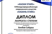 Стали известны результаты IV Международного конкурса современного искусства «КАЗАНЬ-STARS», прошедшего в г.Казань. В номинации «Инструментальное исполнительство» приняли участие учащийся по классу баяна Бикбов Сайдаш и преподаватель Рафиков Д.Ф.