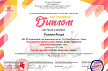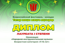Санкт-Петербург шәһәрендә узган "Звездопад" халыкара фестиваль-конкурсы һәм "Мир талантов" халыкара сәнгать һәм иҗат фестивале нәтиҗәләре билгеле булды. Фортепиано бүлеге укучысы Гыйләҗева Айзирә (ук.Мамкина Д.Р.) ике конкурста да 2 дәрәҗә Лауреат исеменә лаек булды! Котлыйбыз!!! -