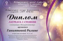 Мәскәү шәһәрендә узган "Art royal" Халыкара фортепиано сәнгате конкурсы нәтиҗәләре билгеле булды. "Дуэтлар" номинациясендә фортепиано бүлеге укучылары Гиниятова Ралина һәм Раимова Милана дуэты (ук. Шәймәрданова З.К.) "ГРАН-ПРИ" исемен яуладылар! -
