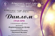 Стали известны результаты Международного конкурса фортепианного искусства "Art royal", прошедшего в г.Москва. В номинации "Дуэты" дуэт учащихся фортепианного отделения Гиниятова Ралина и Раимова Милана (преп. Шаймарданова З.К.) завоевали звание "ГРАН-ПРИ" !!! МОЛОДЦЫ!
