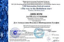 15 января в в культурном центре им.А.С.Пушкина г.Казани состоялся VIII Международный фестиваль-конкурс "Путь к Вифлеемской звезде". Дуэт Ахмадуллина Ильсина и преподаватель Шаймарданова З.К. в номинации "Учитель-ученик" - Лауреат 1 степени!!! Поздравляем с победой!