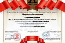 Поздравляем с Победой во Всероссийском фестивале-конкурсе национальных достояний "Золотая грация", прошедшего в г.Санкт-Петербург. В номинации "Инструментальное исполнительство" ученица фортепианного отделения Семенова Карина (преподаватель Мамкина Д.Р.) удостоилась звания Лауреата 1 степени!