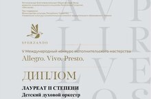 14 ноября 2021 г. в г.Казань при поддержке Министерства культуры Республики Татарстан состоялся V Международный конкурс исполнительского мастерства "Allegro.Vivo.Presto", Детский духовой оркестр нашей школы удостоился Звания Лауреата 2 степени!!! А также награждены Дипломом за лучшие костюмы. Руоводитель оркестра Хасанов М.Р. награжден дипломом "Лучший руководитель". Благодарственными письмами награждены руководитель оркестра Хасанов М.Р., концертмейстеры Юзмеева З.А., Панков В.В. Поздравляем и желаем дальнейших творческих успехов!!!