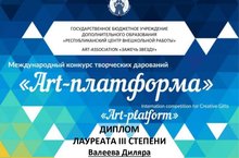 21 марта в г.Казань прошел Международный конкурс творческих дарований "ART-platform" при поддержке ГБУДО "Республиканский центр внешкольной работы", арт-ассоциации "Зажечь звезду". Ученица нашей школы Валеева Диляра стала Лауреатом 3 степени! Поздравляем Диляру и преподавателя Шаймарданову З.К. с успехом!