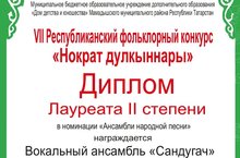 Учащиеся нашей школы приняли участие в VII Республиканском фольклорном конкурсе "Нократ дулкыннары", прошедшего 26 марта в г.Мамадыш. Ансамбль "Сандугач" (рук.Каримуллин Н.Р., Юзмеева З.А.) стал Лауреатом 2 степени, Хасанова Мадина - Дипломантом 3 степени. Поздравляем!!!