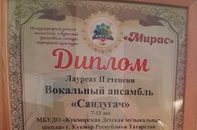 Ансамбль "Сандугач" Кукморской детской музыкальной школы под руководством Каримуллина Н.Р., Юзмеевой З.А. удостоился звания Лауреата 2 степени Международного детско-юношеского и взрослого фестиваля-конкурса татарской культуры «Мирас», прошедшего 28.11.2020 года в г.Самара
