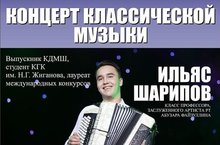 12 марта 2019 года в актовом зале музыкальной школы состоялся "Концерт классической музыки" - выпускника нашей музыкальной школы по классу баяна, студента Казанской государственной консерватории им.Н.Г.Жиганова, лауреата международных конкурсов Ильяса Шарипова. В концерте также принял участие студент КГК им.Н.Г.Жиганова Илья Потапов (домра), ведущий концерта Руслан Гильмутдинов. В исполнении музыкантов произвучали произведения различных жанров, зарубежных, русских и татарских композиторов.