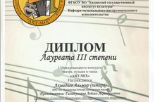 24 февраля вокальный ансамбль "Сердэш" в составе преподавателей Курочкиной А.М., Шаймардановой З.К, Мамкиной Д.Р. приняли участие в I Международном конкурсе театра, музыки и танца " Art-Mix" в г.Казань и стали Лауреатами 2 степени в номинации "Вокальное творчество". Подравляем наших преподавателей с победой и желаем творческих успехов!