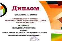 Гимадиева Суюмбика, учащаяся объединения «Умелые руки» ЦДТ «Галактика» стала Дипломантом 3 степени республиканского конкурса изобразительного и декоративно – прикладного искусства «ART – PAINT» (рук. Галлямова Аниса Марселевна).