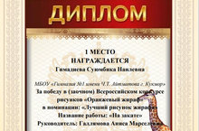 С целью выявления талантливых детей и педагогов проводился всероссийский конкурс рисунков «Оранжевый жираф». Учащаяся объединения «Умелые руки» ЦДТ «Галактика» Гимадиева Суюмбика удостоилась Диплома 1 степени (рук. Галлямова Аниса Марселевна).