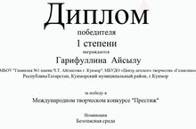 В международном творческом конкурсе «Престиж» в номинации «Безопасная среда» учащаяся объединения «Умелые руки» ЦДТ «Галактика» Гарифуллина Айсылу заняла 1 место (рук. Галлямова А.М.).