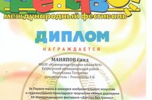 Маняпов Саид, "ДОО "СБИМ", "МБОУ "Кукморская средняя школа №4", (рук. Ромазаноава Е.В.) - 1 место в конкурсе изобразительного искусства декоративно-прикладного творчества "Юные дарования".