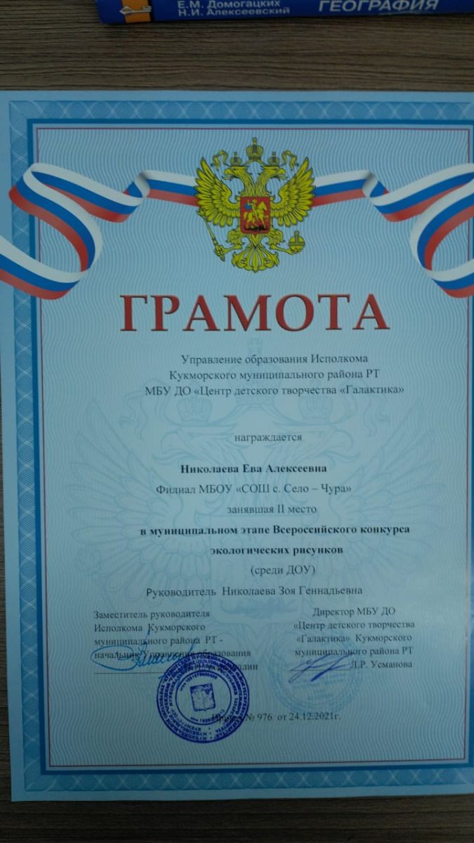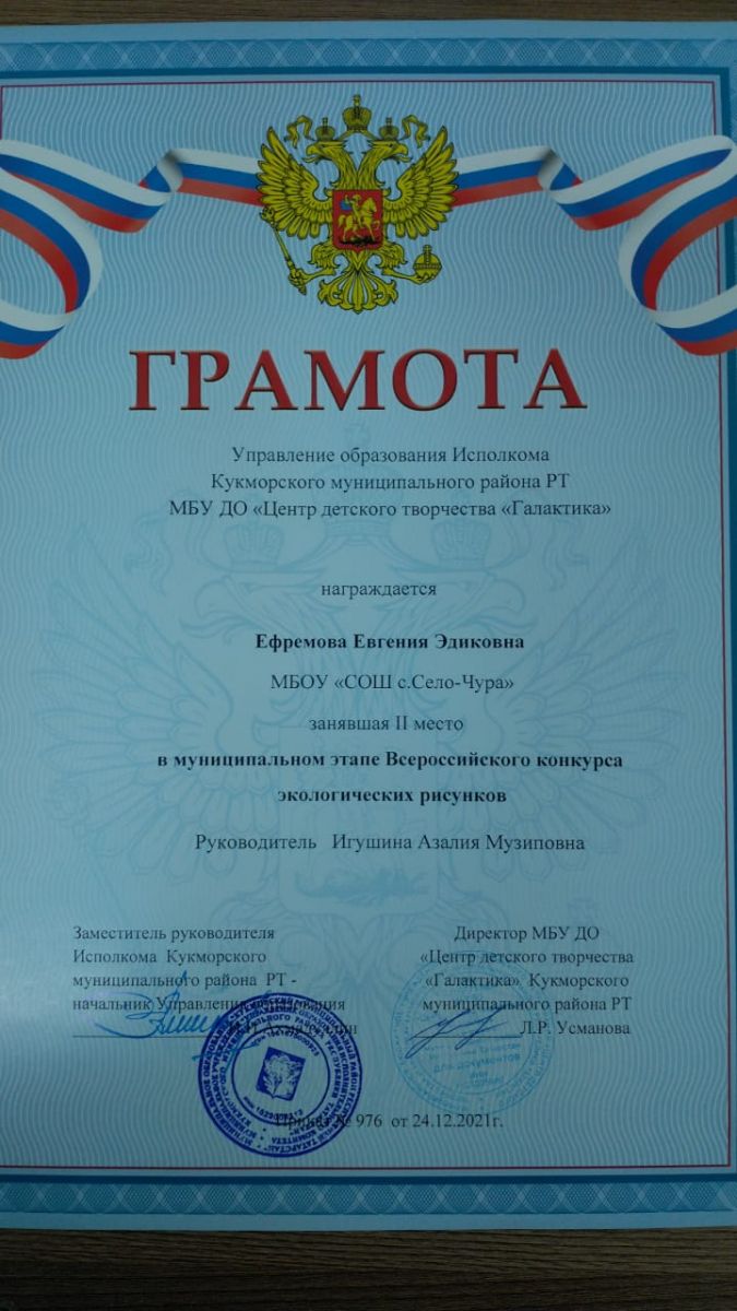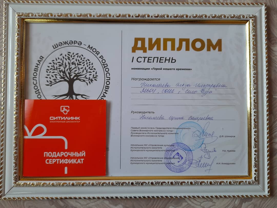 В районном Доме культуры состоялся заключительный этап Всероссийского конкурса-фестиваля "Родословная-моя родовая". Во второй тур было отобрано 13 работ. Ученица 7 класса нашей школы Николаева Эльза стала лауреатом в номинации" Герой нашего времени". Поздравляем её с такой большой победой! Руководитель: Николаева Ирина Валерьевна/Район мәдәният йортында Бөтенроссия "Шәҗәрә-моя родословная" бәйге-фестиваленең йомгаклау этабы булды. Икенче турга 13 эш алынган иде. Мәктәбебезнең 7нче сыйныф укучысы Николаева Эльза " Безнең заман герое" номинациясендэ 1урынга лаек булды. Укучыбызны шундый зур жиңуе белән тәбриклибез! Җитәкчесе:Николаева Ирина Вплерьевна