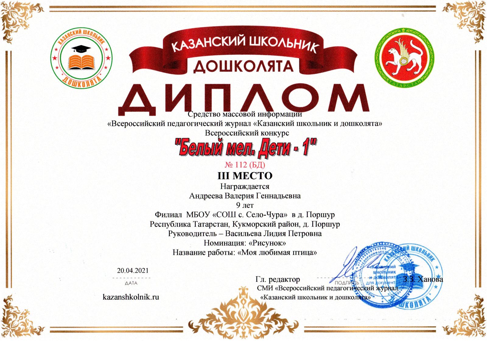 Итоги Всероссийского конкурса “Белый мел. Дети”-1./ “Ак акбур. Балалар”-1 Бөтенроссия конкурсы нәтиҗәләре.