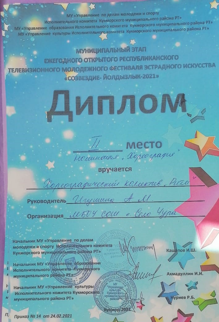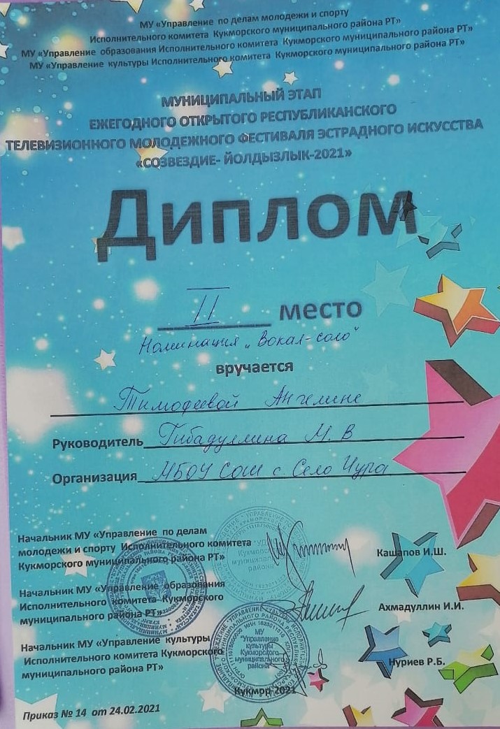 Поздравляем ученицу 6 класса Тимофееву Ангелину со 2 местом в номинации "Вокал-соло" и танцевальный коллектив "Ритм" со 2 местом в номинации "Хореография" в муниципальном этапе ежегодного республиканского фестиваля "Созвездие- Йолдызлык-2021" МОЛОДЦЫ!!!/