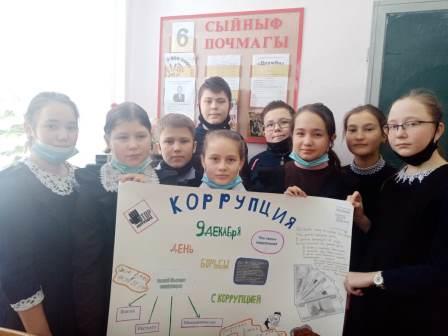 В рамках месячника по противодействию коррупции в школе проведены классные часы и различные конкурсы. В старших классах классные часы « Коррупции — Нет!»,«Коррупция и права человека»; в 1-5 классах конкурс рисунков конкурс рисунков «Знай не допускай!». Обучающиеся 6 класса отличились своим плакатом на данную тематику, а у 7 класса лучше всего получились рисунки. / Коррупциягә каршы тору айлыгы кысаларында мәктәптәбебездә сыйныф сәгатьләре һәм төрле конкурслар үткәрелде. Өлкән сыйныфларда « Коррупциягә-юк!», "Коррупция һәм кеше хокуклары» дип исемләнгән тәрбия сәгатьләре; 1-5 сыйныфларда" Бел, юл куйма!» рәсемнәр конкурсы. 6 нчы сыйныф укучылары әлеге тематикага үз плакатлары белән аерылып тордылар, ә 7 нче сыйныф укучылары иң яхшы итеп рәсемнәр ясадылар.