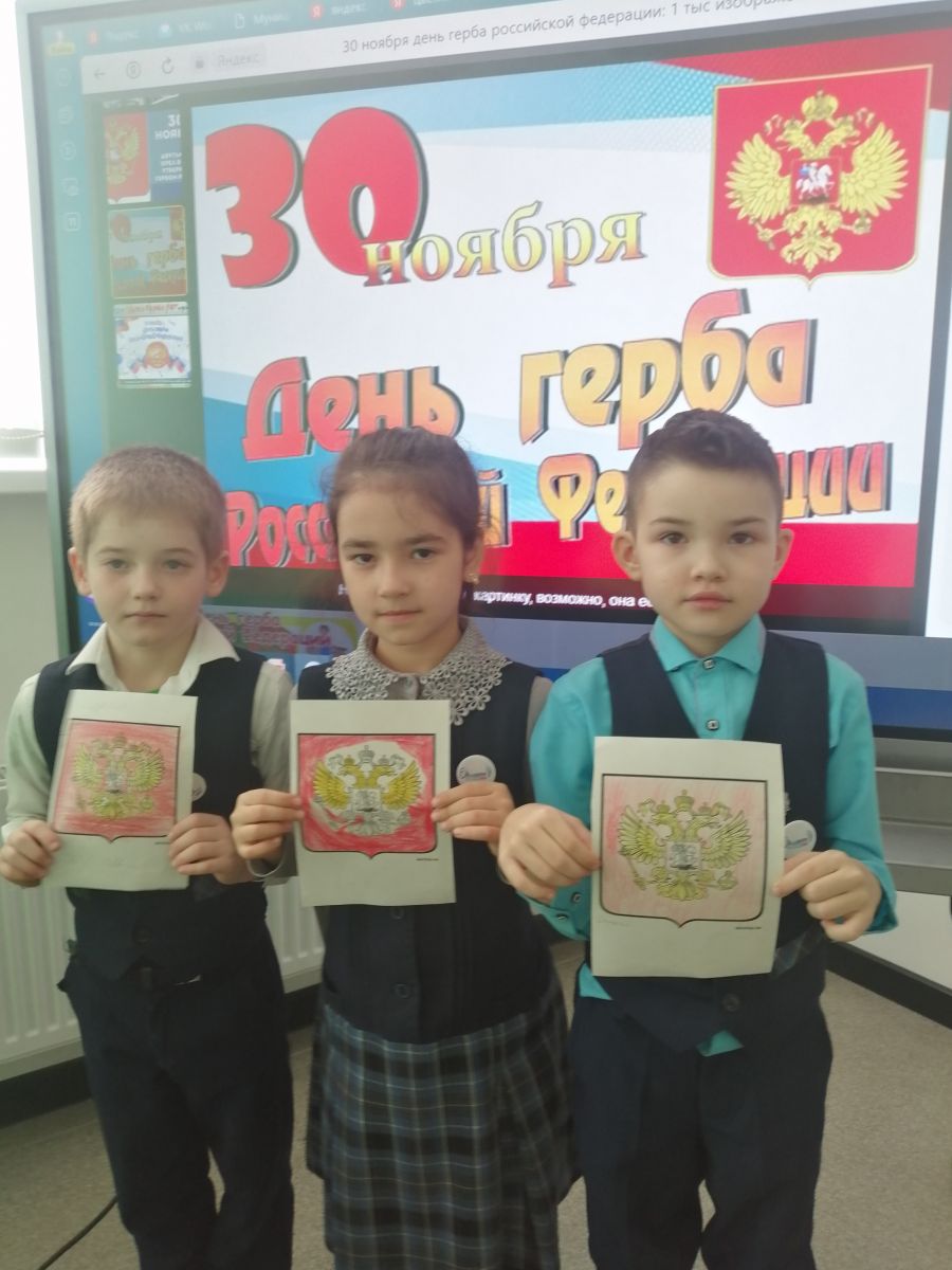30 ноябрь Россия Федерациясенең герб көне. Педагог-оештыручы башлангыч сыйныф укучылары белән «Россия гербы белән танышабыз» дип исемләнгән сыйныфтан тыш чара уздырды.