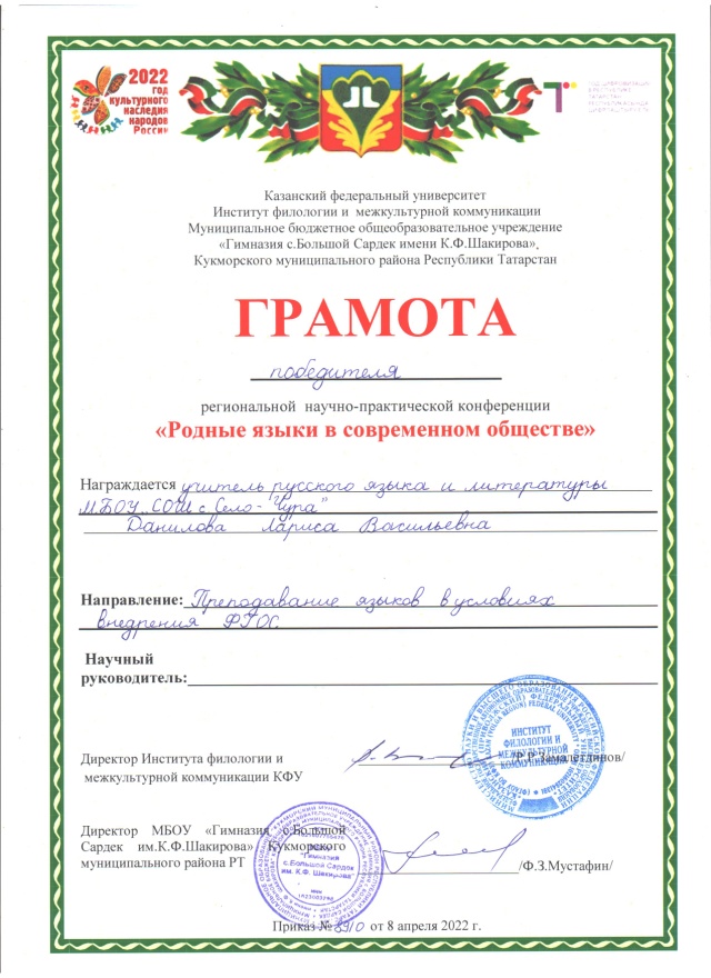 Учитель русского языка и литературы Данилова Лариса Васильевна стала победителем в региональной научно-практической конференции «Родные языки в современном обществе». Поздравляем! / Рус теле һәм әдәбияты укытучысы Данилова Лариса Васильевна «Хәзерге җәмгыятьтә туган телләр» региональ фәнни-гамәли конференциясендә җиңүче булды. Котлыйбыз! -