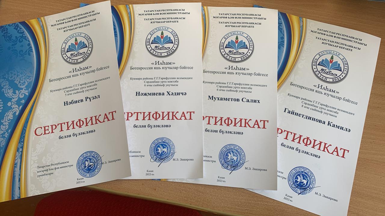 5 нче апрель көнне Арча шәһәренең 6 нчы мәктәбендә "Илһам" Бөтенроссия яшь язучылар бәйгесенең зона туры узды. Анда беренче турны уңышлы узган укучылар катнашты. Безнең мәктәптән Набиев Рүзәл, Мөхәммәтов Салих, Нәҗмиева Хәдичә, Гайнетдинова Камиләләр икенче турга уздылар һәм уңышлы гына чыгыш ясадылар. Уңай нәтиҗәләр көтәбез. Җитәкчеләр- Кадырова Энҗе Хәйдәр кызы, Низамова Гөлзадә Илсур кызы.