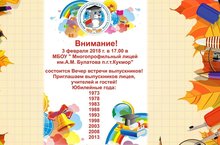 Внимание!3 февраля 2018 г. в 16.30 в МБОУ " Многопрофильный лицей им.А.М. Булатова п.г.т.Кукмор" состоится Вечер встречи выпускников!Приглашаем выпускников лицея, учителей и гостей!Юбилейные года:197319781983198819931998200320082013 -