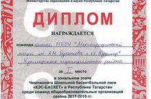 Поздравляем команду юношей нашего лицея, занявшую 1 место в зональном этапе Чемпионата Школьной баскетбольной Лиги "КЭС -Баскет" в Республике Татарстан среди команд общеобразовательных организаций сезона 2017-2018гг! Вы большие молодцы! Мы вами гордимся!