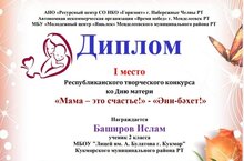 Поздравляем ученика 2Г класса Баширова Ислама (рук. Хасбиева Г. Е.) с победой в Республиканском творческом конкурсе "Мама-это счастье!“/2нче сыйныф укучысы Бәширов Исламны "Әни - ул бәхет" республика конкурсында җиңү яулавы белән котлыйбыз! (җитәкчесе - Хасбиева Г. Е.) 22.12.2022